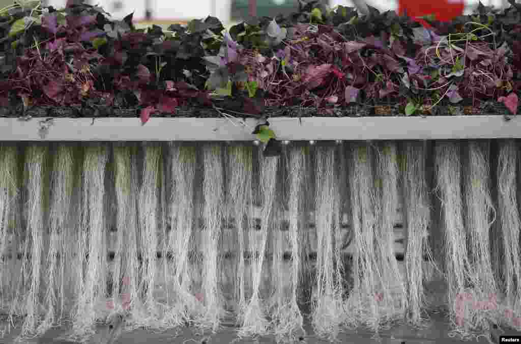 Plant roots are pictured at the Plant Advanced Technologies (PAT) company greenhouse in Laronxe near Nancy, Eastern France. Plants are grown in a special way with a view to "milking" them for use in medicines, cosmetics and agrochemicals.