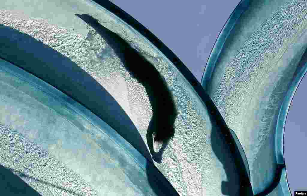 A visitor is silhouetted as she slides down a huge water pipe at a public swimming pool on a hot sunny day in Vienna, Austria.